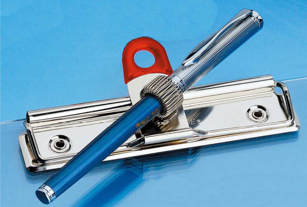 Ferragem de pressão com suporte para suspensão e para caneta rebatível.