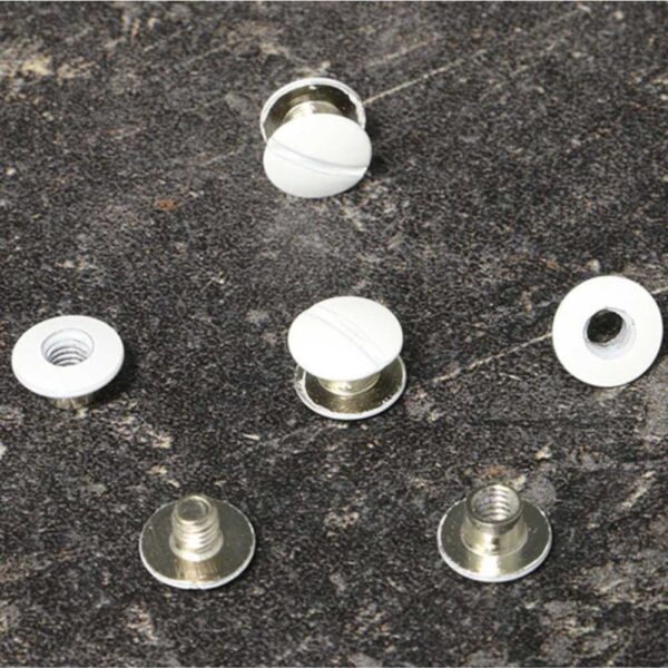Parafusos de rosca niquelados com topos brancos.
